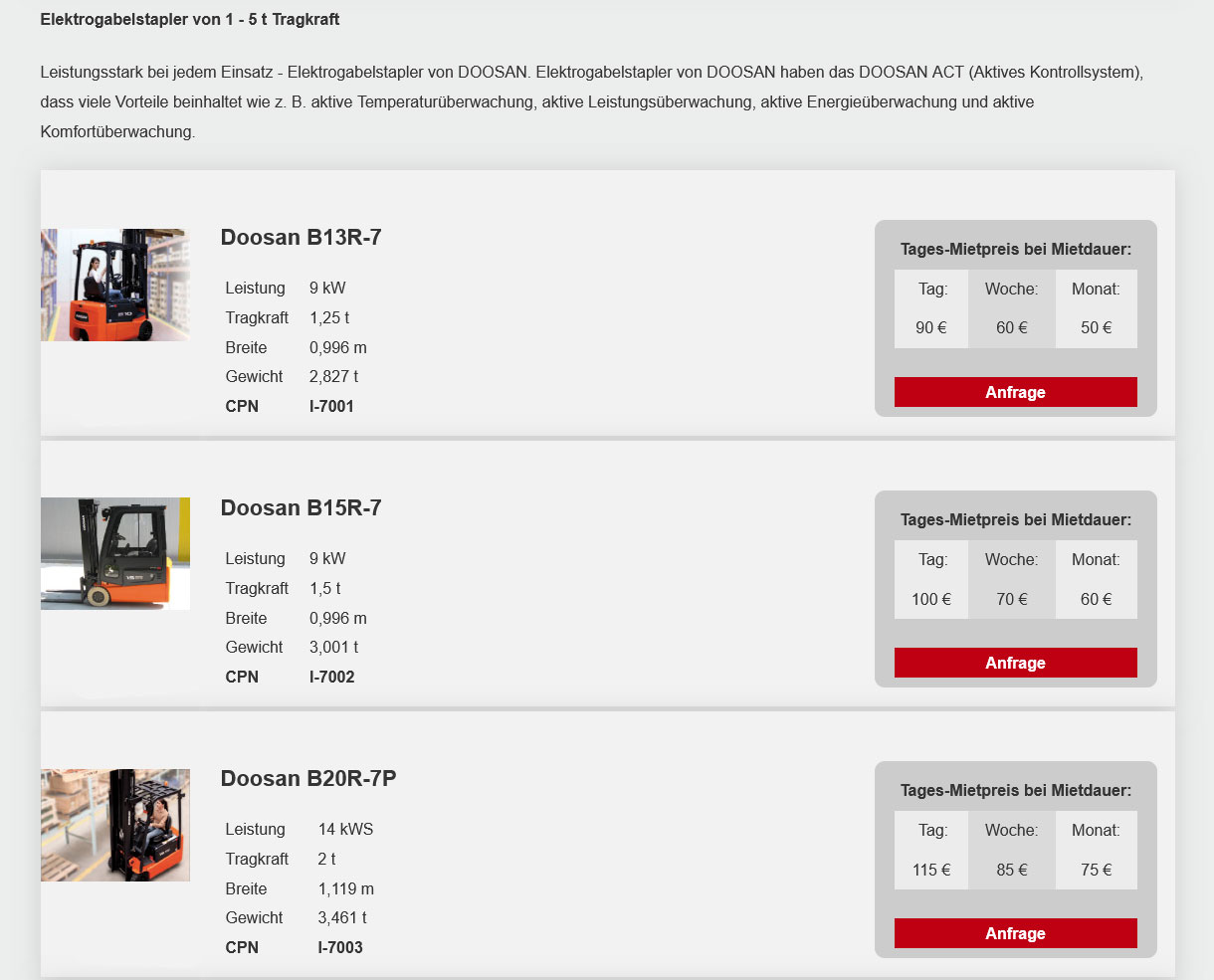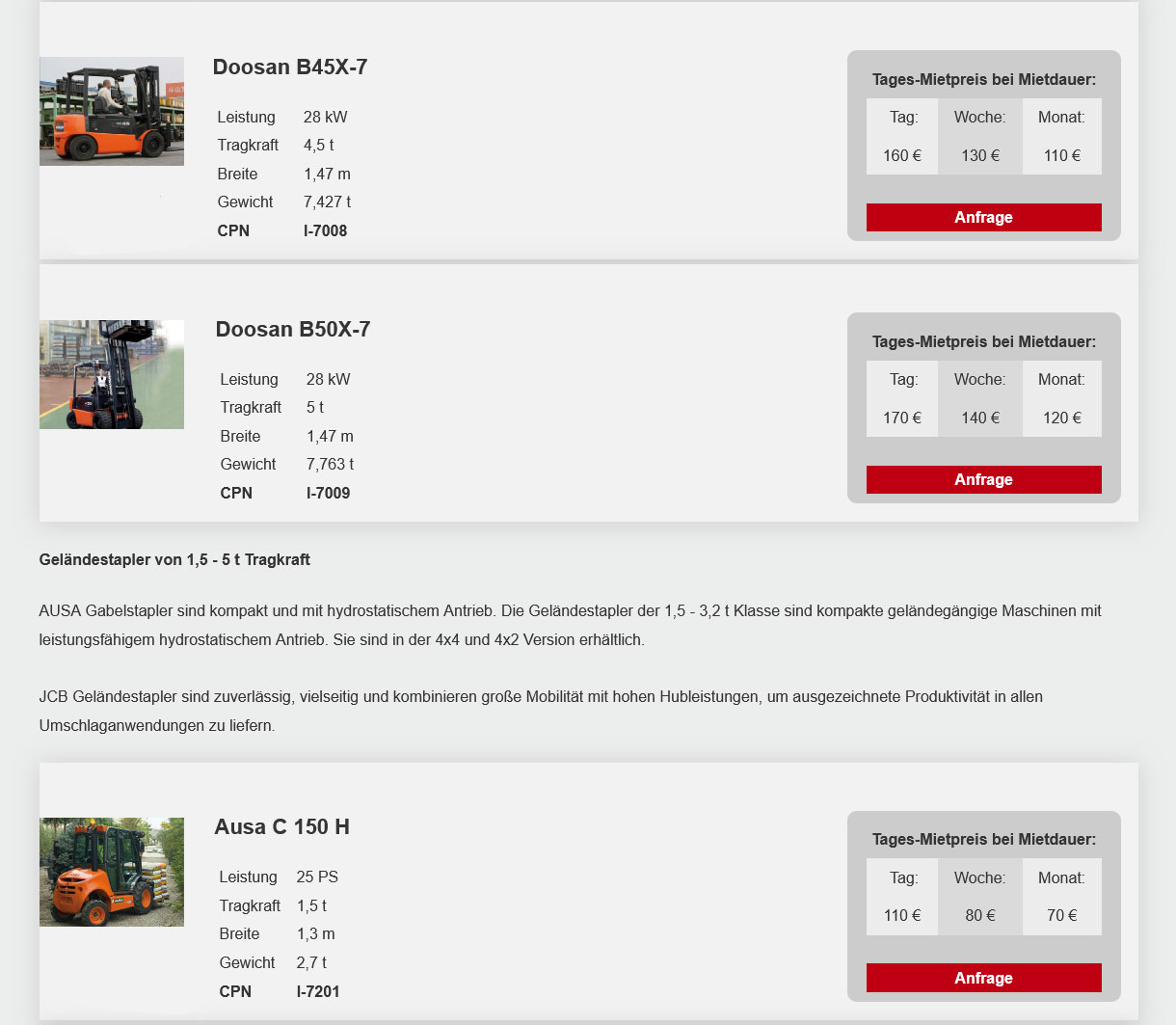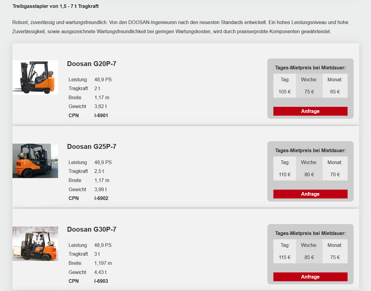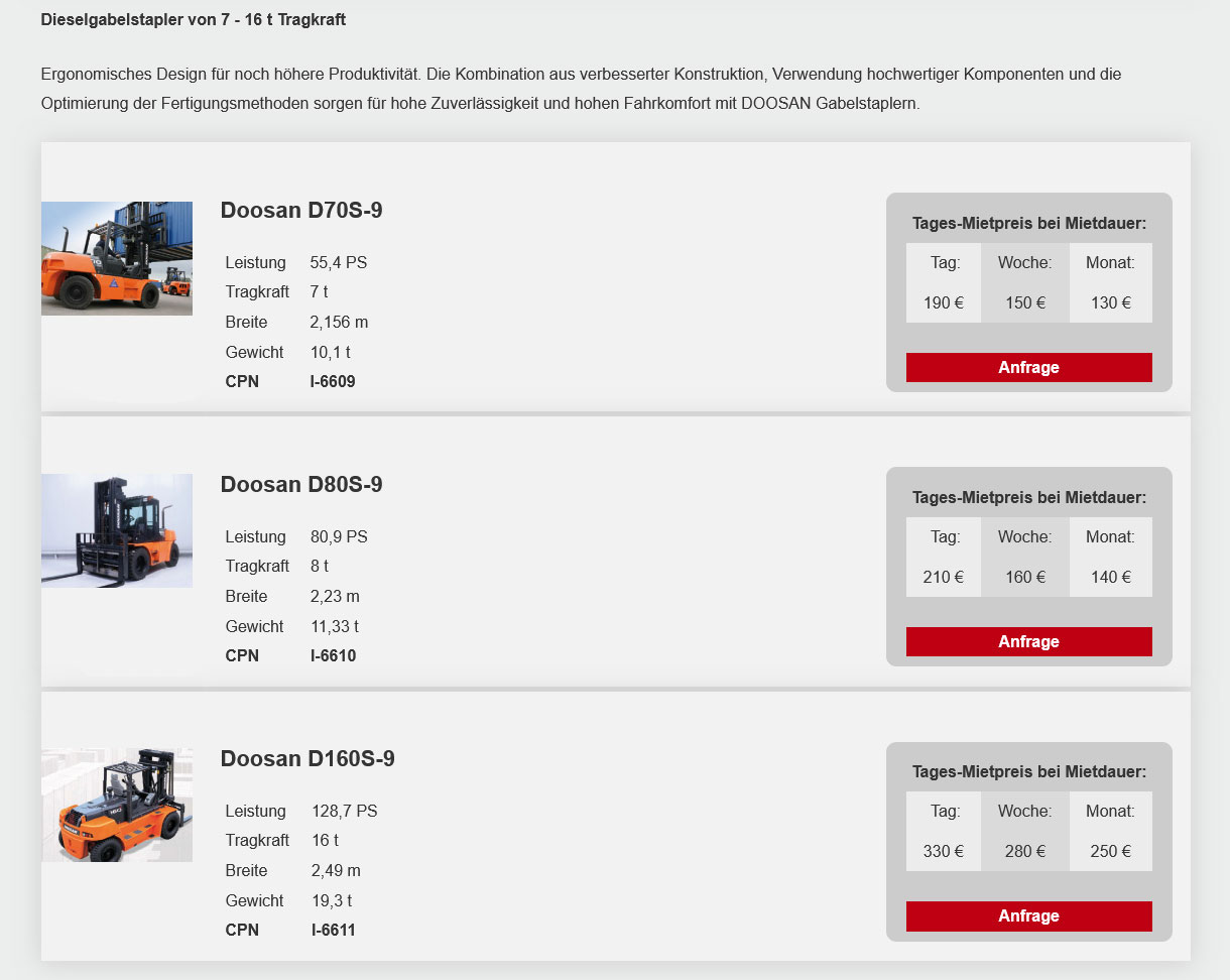 (Mietpreise pro Tag in €, zzgl. MwSt. Die Tagesmiete wird auf Grundlage einer Schichtzeit von 8 Std. berechnet. Jede weitere Std. (bis max. 4 Std.) wird als 1/8 der Tagesmiete berechnet. Preise ohne Betriebsstoffe, Verbrauchsmaterial und Maschinenbruchversicherung.)