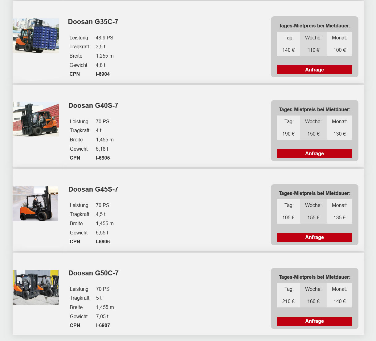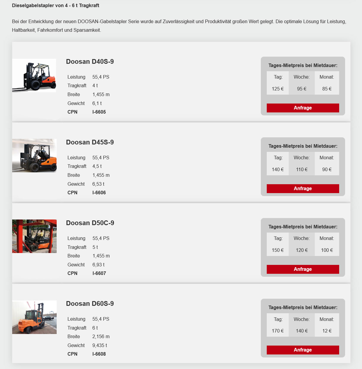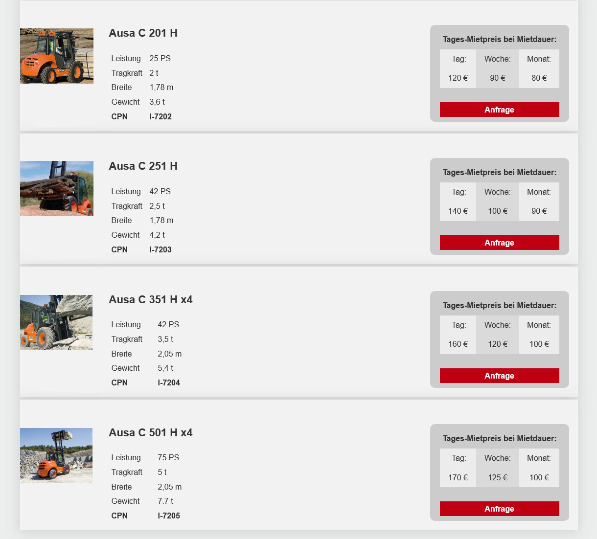 (Mietpreise pro Tag in €, zzgl. MwSt. Die Tagesmiete wird auf Grundlage einer Schichtzeit von 8 Std. berechnet. Jede weitere Std. (bis max. 4 Std.) wird als 1/8 der Tagesmiete berechnet. Preise ohne Betriebsstoffe, Verbrauchsmaterial und Maschinenbruchversicherung.)