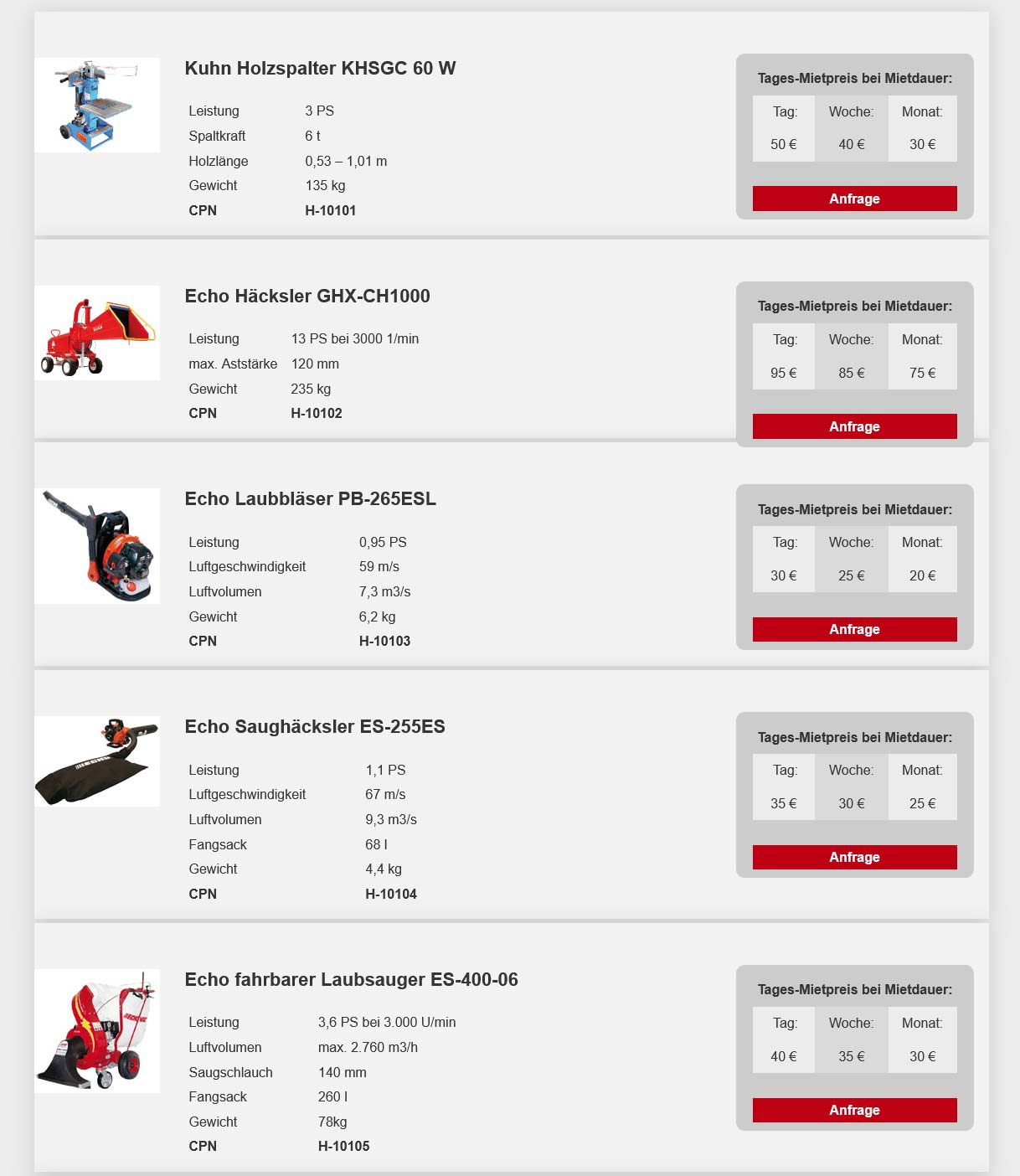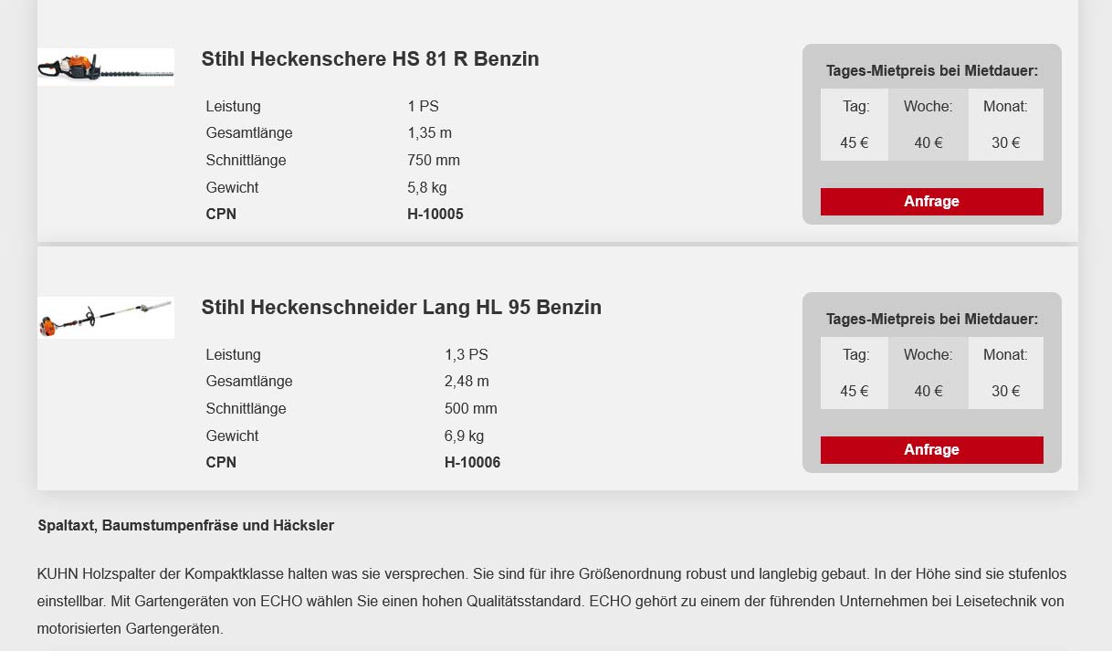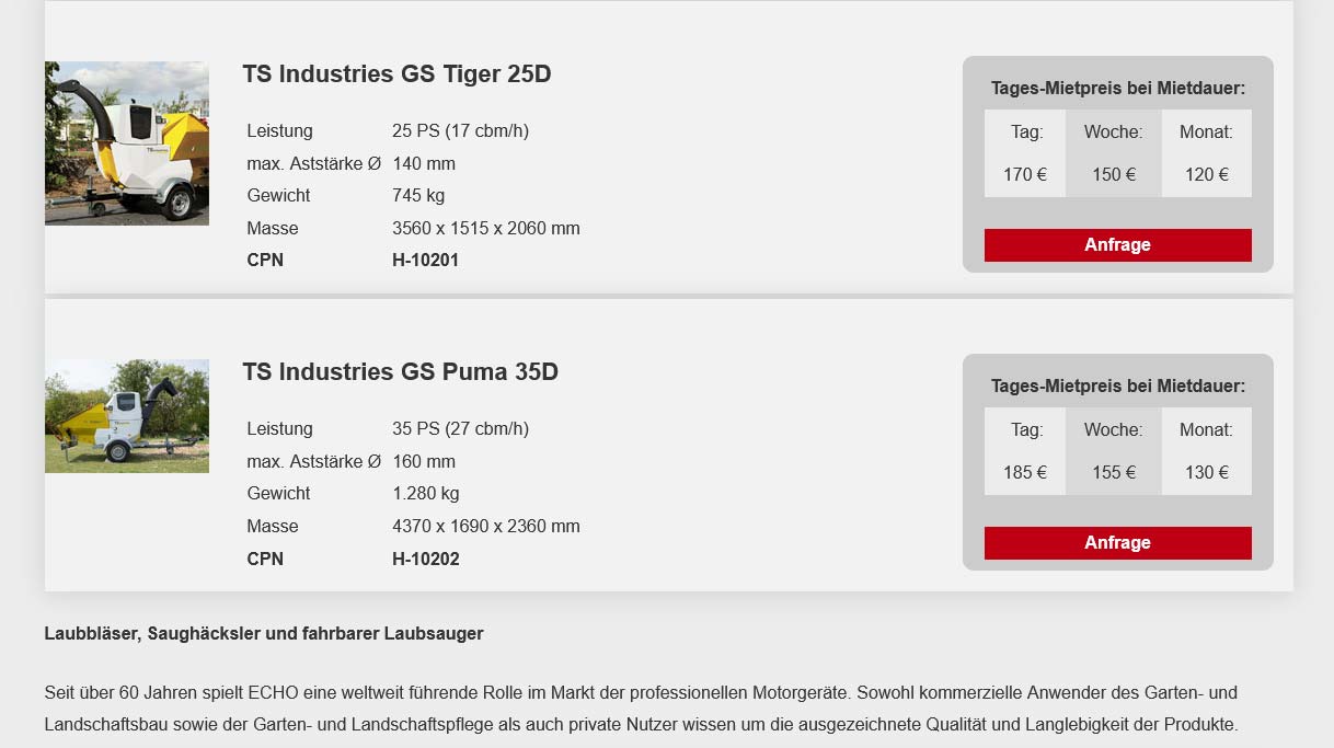 (Mietpreise pro Tag in €, zzgl. MwSt. Die Tagesmiete wird auf Grundlage einer Schichtzeit von 8 Std. berechnet. Jede weitere Std. (bis max. 4 Std.) wird als 1/8 der Tagesmiete berechnet. Preise ohne Betriebsstoffe, Verbrauchsmaterial und Maschinenbruchversicherung.)