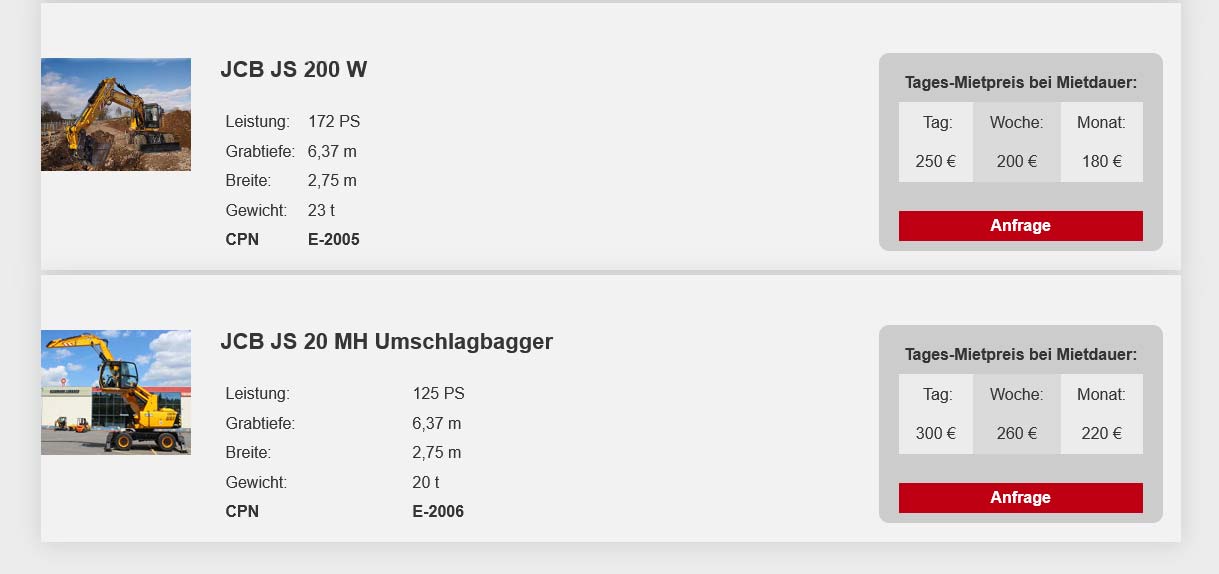 (Mietpreise pro Tag in €, zzgl. MwSt. Die Tagesmiete wird auf Grundlage einer Schichtzeit von 8 Std. berechnet. Jede weitere Std. (bis max. 4 Std.) wird als 1/8 der Tagesmiete berechnet. Preise ohne Betriebsstoffe, Verbrauchsmaterial und Maschinenbruchversicherung.)