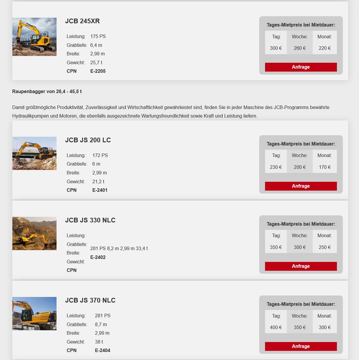 (Mietpreise pro Tag in €, zzgl. MwSt. Die Tagesmiete wird auf Grundlage einer Schichtzeit von 8 Std. berechnet. Jede weitere Std. (bis max. 4 Std.) wird als 1/8 der Tagesmiete berechnet. Preise ohne Betriebsstoffe, Verbrauchsmaterial und Maschinenbruchversicherung.)
