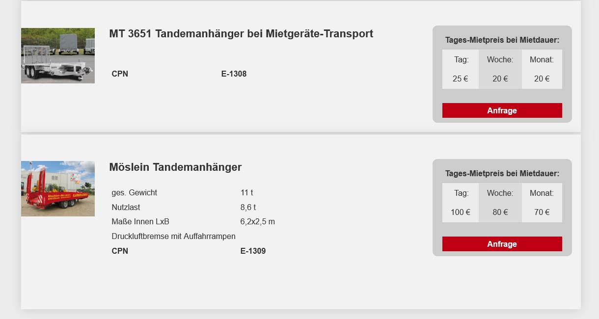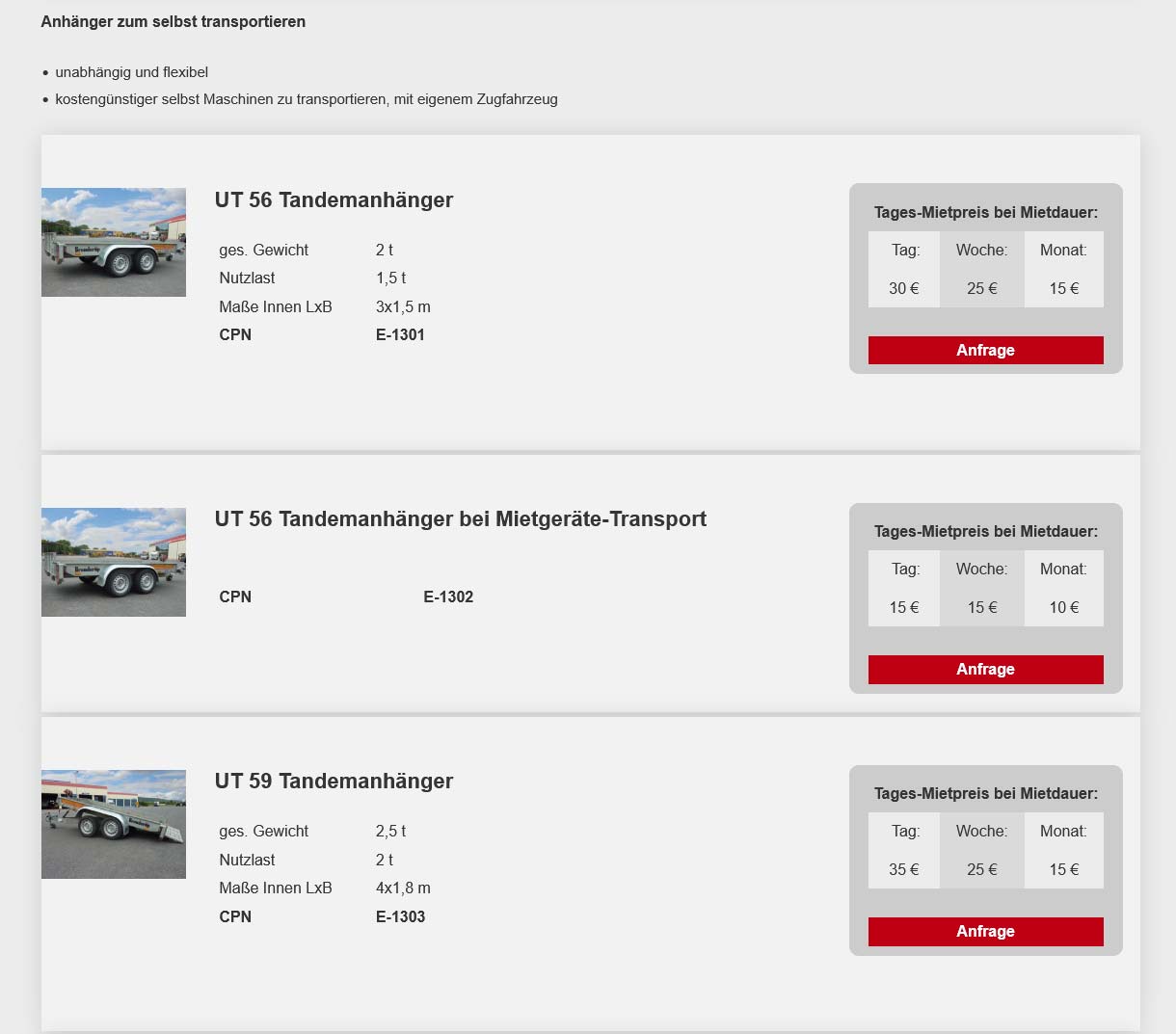 (Mietpreise pro Tag in €, zzgl. MwSt. Die Tagesmiete wird auf Grundlage einer Schichtzeit von 8 Std. berechnet. Jede weitere Std. (bis max. 4 Std.) wird als 1/8 der Tagesmiete berechnet. Preise ohne Betriebsstoffe, Verbrauchsmaterial und Maschinenbruchversicherung.)