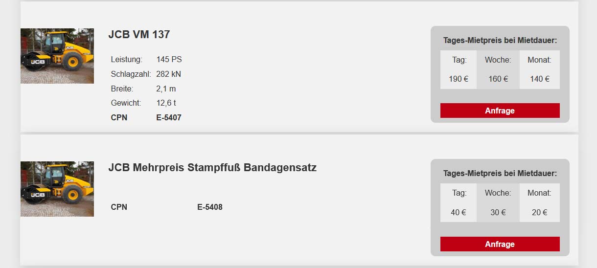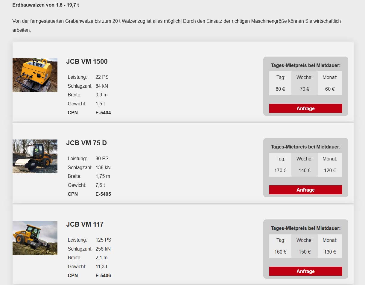 (Mietpreise pro Tag in €, zzgl. MwSt. Die Tagesmiete wird auf Grundlage einer Schichtzeit von 8 Std. berechnet. Jede weitere Std. (bis max. 4 Std.) wird als 1/8 der Tagesmiete berechnet. Preise ohne Betriebsstoffe, Verbrauchsmaterial und Maschinenbruchversicherung.)